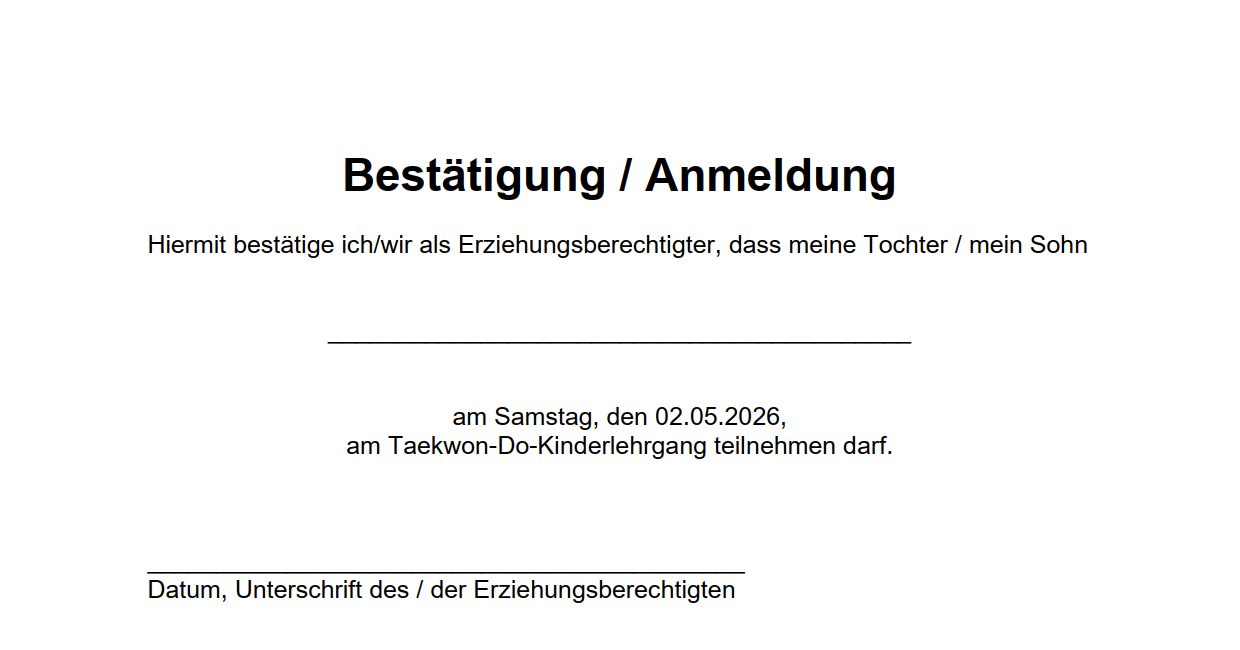 Liebe Taekwon-Do`ler und alle die es noch werden wollen. Die Sommerferien sind zu Ende, heute ist der erste Schultag für die Kinder. Unser Taekwon-Do Training beginnt in dieser Woche erstmals am Donnerstag den 15. September. Die Trainingszeiten haben sich nicht geändert, das heißt Beginn für die Kindergruppe um 18:30 Uhr in der TSV-Turnhalle (Bahnhofstraße) bis 19:30 Uhr, anschließend trainieren die Erwachsenen bis 21:00 Uhr. Am kommenden Montag läuft es ebenfalls wieder so, wie vor den Ferien, dann findet das Training allerdings in der Schulturnhalle statt.