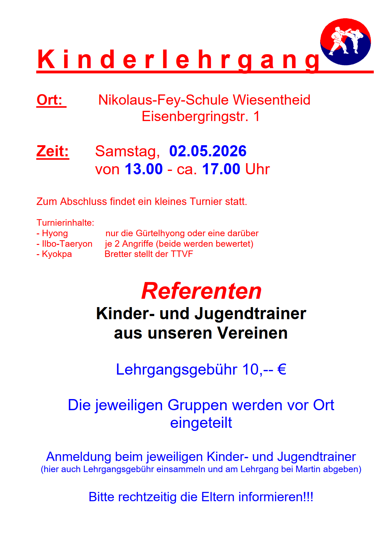 Liebe Taekwon-Do`ler, der Termin für den Kinderlehrgang in Wiesentheid hat sich um eine Woche verschoben. Ursprünglich war die Veranstaltung für den 25. April geplant, allerdings ist die Schultunrhallte zu diesem Zeitpunkt belegt, so dass wir eine Woche später - am Samstag den 2. Mai - dort unseren Kindelehrgang abhalten werden. Beginn ist um 13:00 Uhr. Wir freuen uns auf euer zahlreiches Erscheinen!